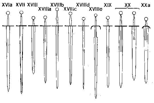 Specjaliści wyróżniają 23 typy mieczy z okresu między początkiem XI a końcem XV wieku, oprócz tego istnieje szczegółowa klasyfikacja samych jelców i głowic (nb. tak popularna w filmach głowica tarczowa pojawiła się na dobre dopiero w XII wieku). Trzeba pamiętać, że kształt klingi był w dużej mierze uwarunkowany potrzebami szermierki. O ile między XI a XIII wiekiem kształt ten zmieniał się w niewielkim stopniu (rys) o tyle w XIV wieku zaczęły pojawiac się nowe odmiany.